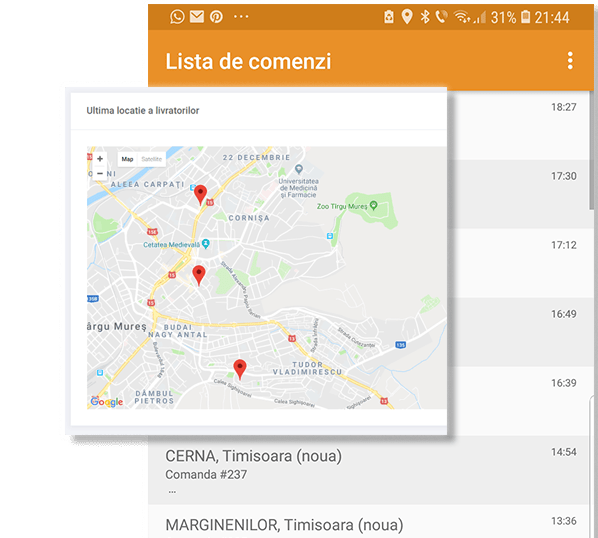 Unul dintre avantajele majore ale aplicatiei este integrarea hartilor, care permite monitorizarea in timp real a pozitiei si traseului fiecarui livrator. Aceasta functionalitate nu doar ca imbunatateste coordonarea echipei, optimizand astfel rutele si timpii de livrare. Monitorizarea constanta a statusului livrarilor contribuie la cresterea eficientei si la reducerea erorilor in procesul de distributie.